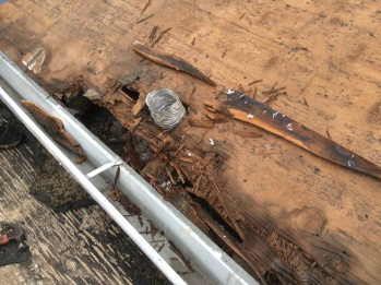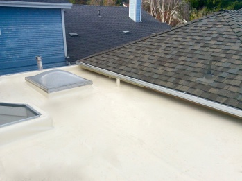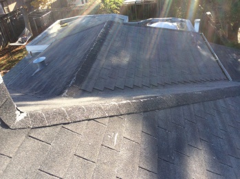 Roof completed. Soffit vents (not shown), were installed for intake attic ventilation. Roof mounted, electric attic fan installed for attic exhaust ventilation. Fan is thermostatically controlled to automatically turn on when the heat in the attic reaches a certain temperature. Pipes have Wil-Mar Collars which are designed to prevent water from entering the living area through the pipes. Wil-Mar Collars are warranteed for the life of the roof.